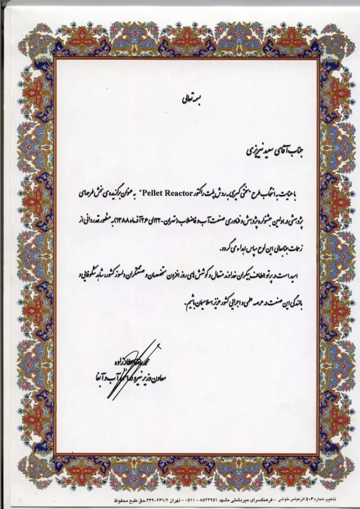 در این سال پایلوت راکتور بستر شناور (Crystallizer) به عنوان پروژه برتر آب و فاضلاب کشور در نمایشگاه پژوهش و فناوری شرکت های آب و فاضلاب انتخاب گردید.